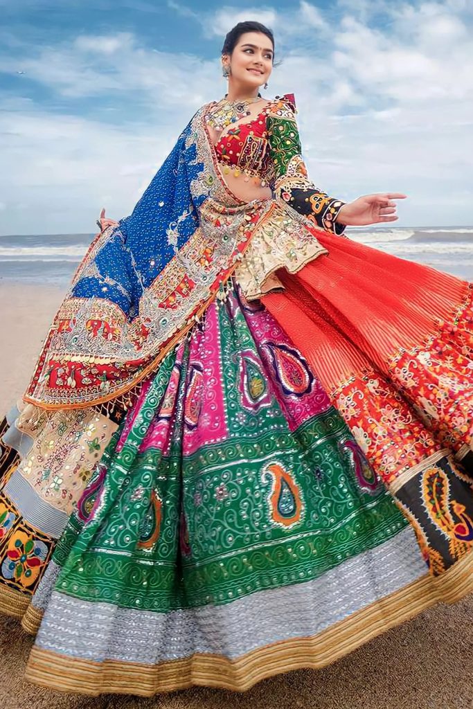 Women traditionally wear a three-piece dress called the ‘Chaniya Choli.’ It consists of a blouse (choli), a flared, ankle-length skirt (chaniya), and a long cloth draped over the shoulder (dupatta). The dresses are adorned with mirror work, embroidery, and vibrant patterns.