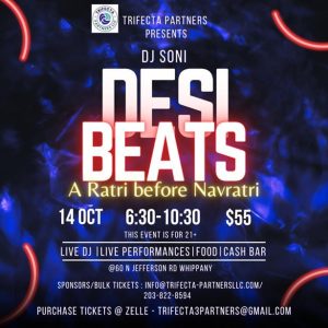 “Garba” refers to the traditional dance performed during Navratri, and “Desi Beats” suggests a fusion of traditional and contemporary music and dance styles. Such events often feature lively and colorful performances, with people dancing to the beats of traditional and modern music, dressed in traditional attire.